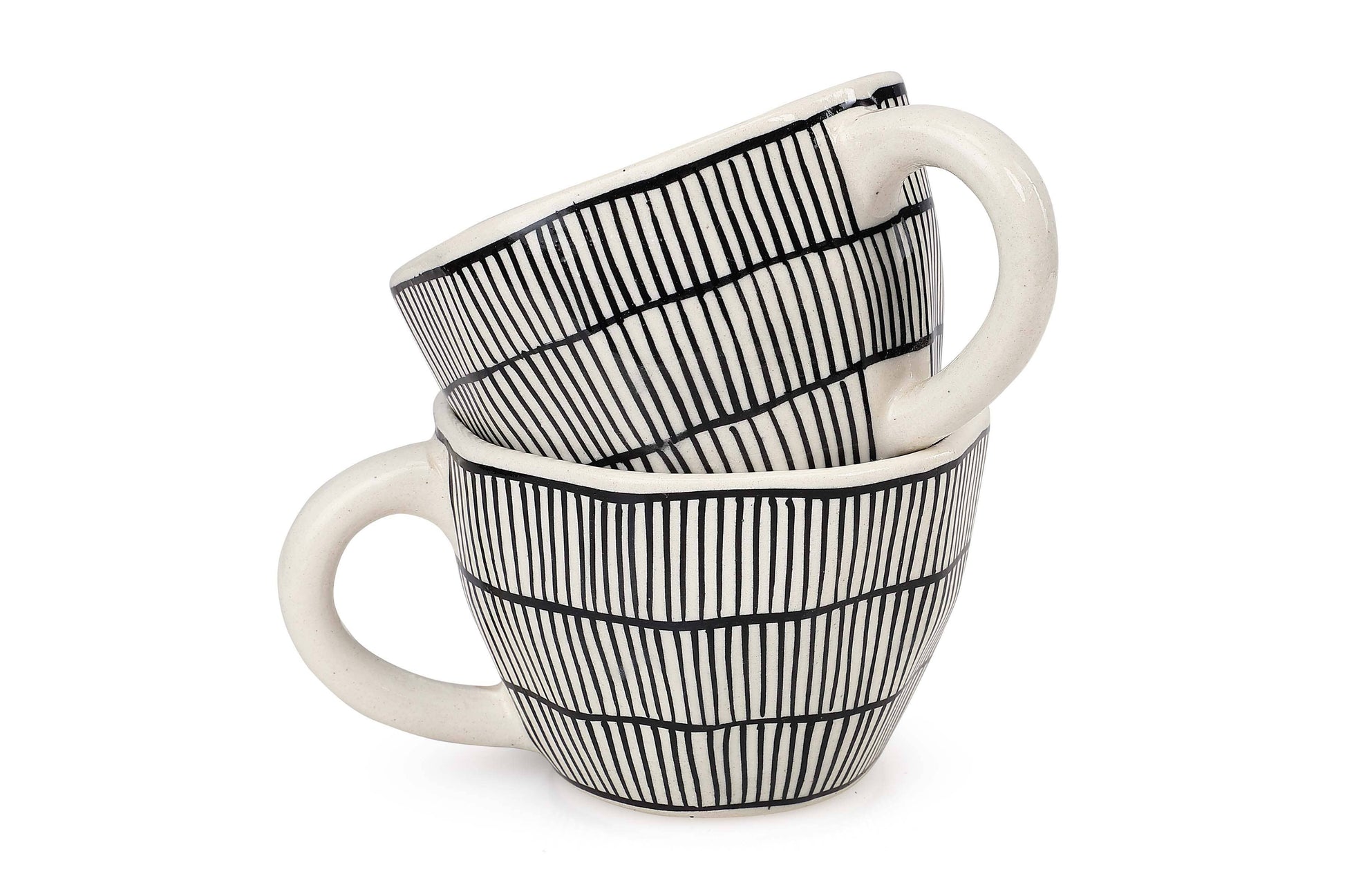Ceramic tea coffee cup with an abstract designs. Made with high-quality ceramic material, this cup features an eye-catching mix of lines and shapes on an ivory background. To clean, hand wash with mild soap and avoid using abrasive materials like steel wool. The ergonomic handle ensures a comfortable grip, while the wide opening makes it easy to enjoy your favorite hot beverages. Perfect for anyone who loves a touch of artistry in their daily routine. Microwave, Dishwasher and Food Safe. • Capacity - 250 ml • Hand Made in Khurja