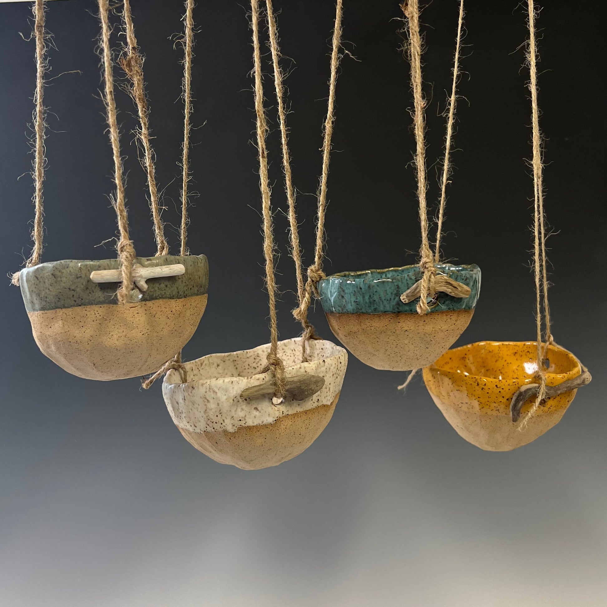 These hanging pods were made by hand using speckled stoneware then dipped in glaze inside and out giving them the two tone effect. They have a piece of driftwood to give it a special touch. Holes were added on top for easy hanging, jute with a loop at the top for easy hanging. Each piece is unique with slight variations in height, width, and glaze consistency. The size is approximately 5"across and 3 1/2" deep. Available in Agate, Cream, Jade or Mustard.