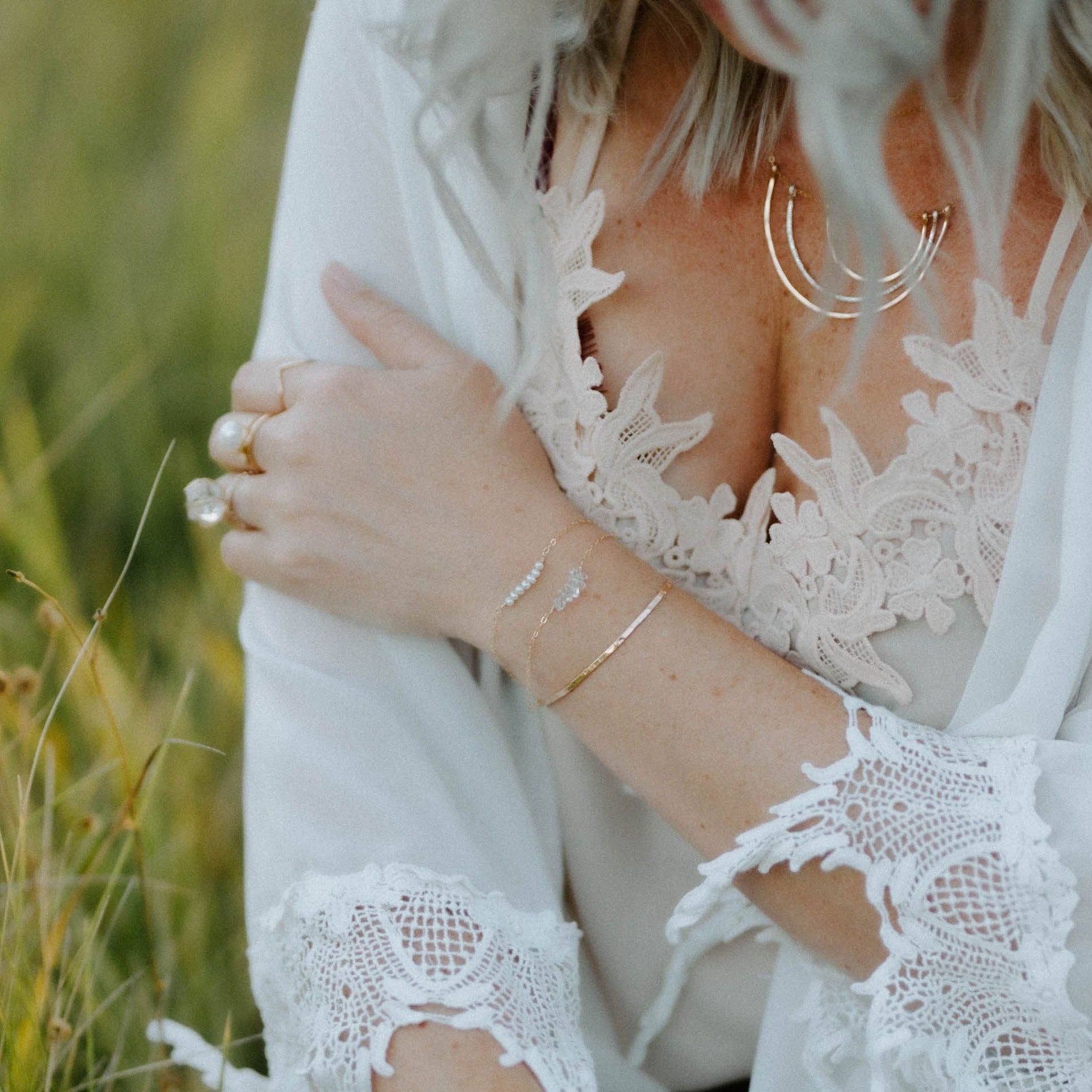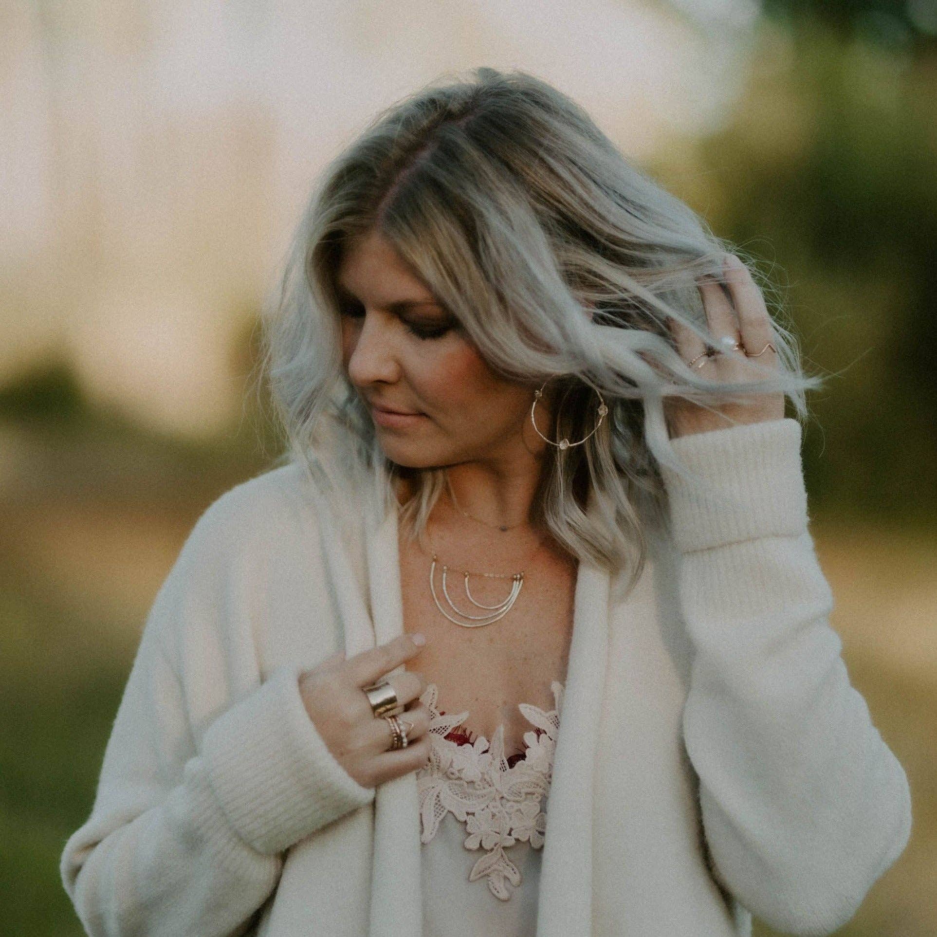 The Reflection Rainbow necklace is a beautiful piece hand shaped, hammered, textured in your choice of 14k gold fill or sterling silver with a dainty chain. Best seller.