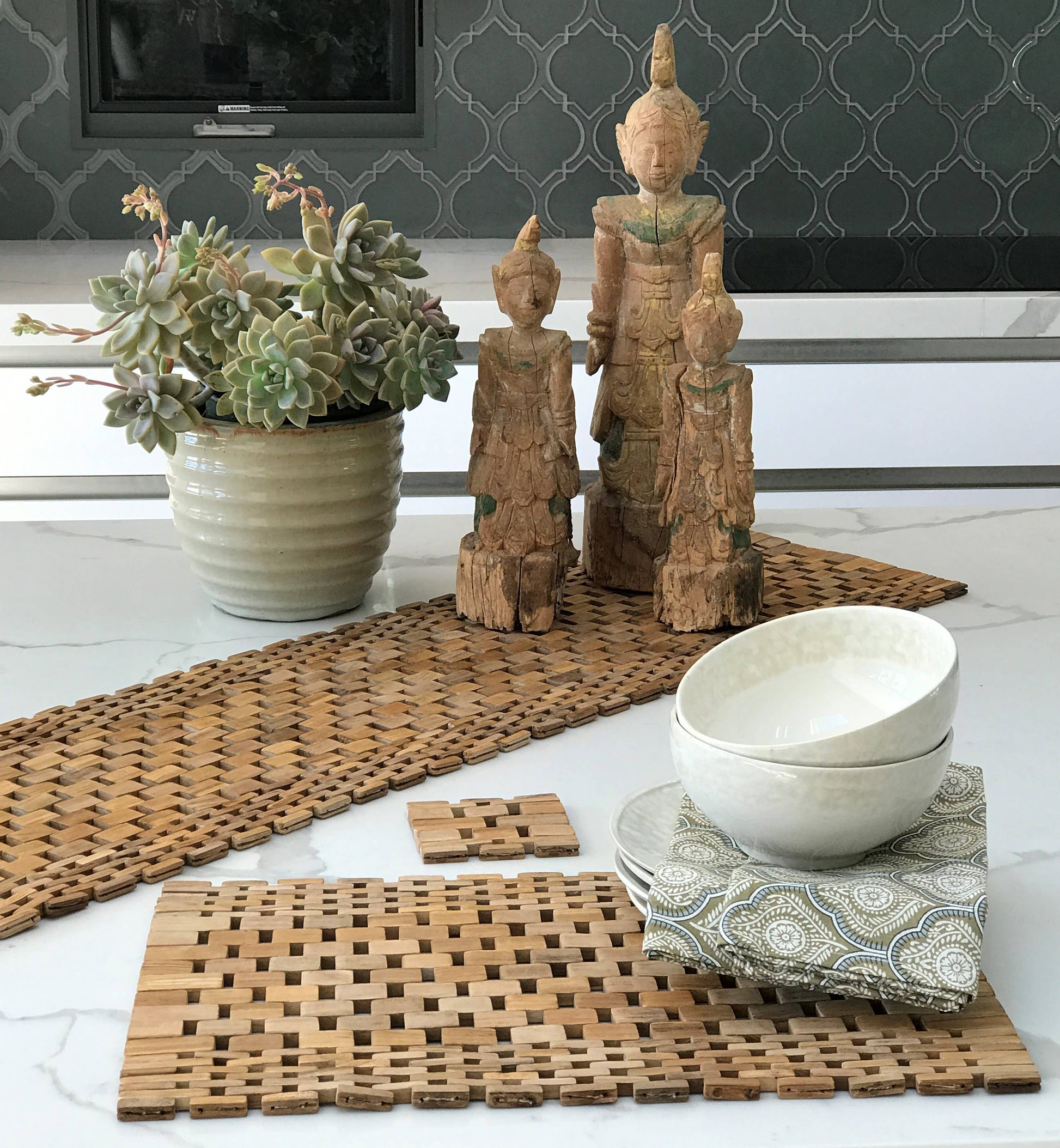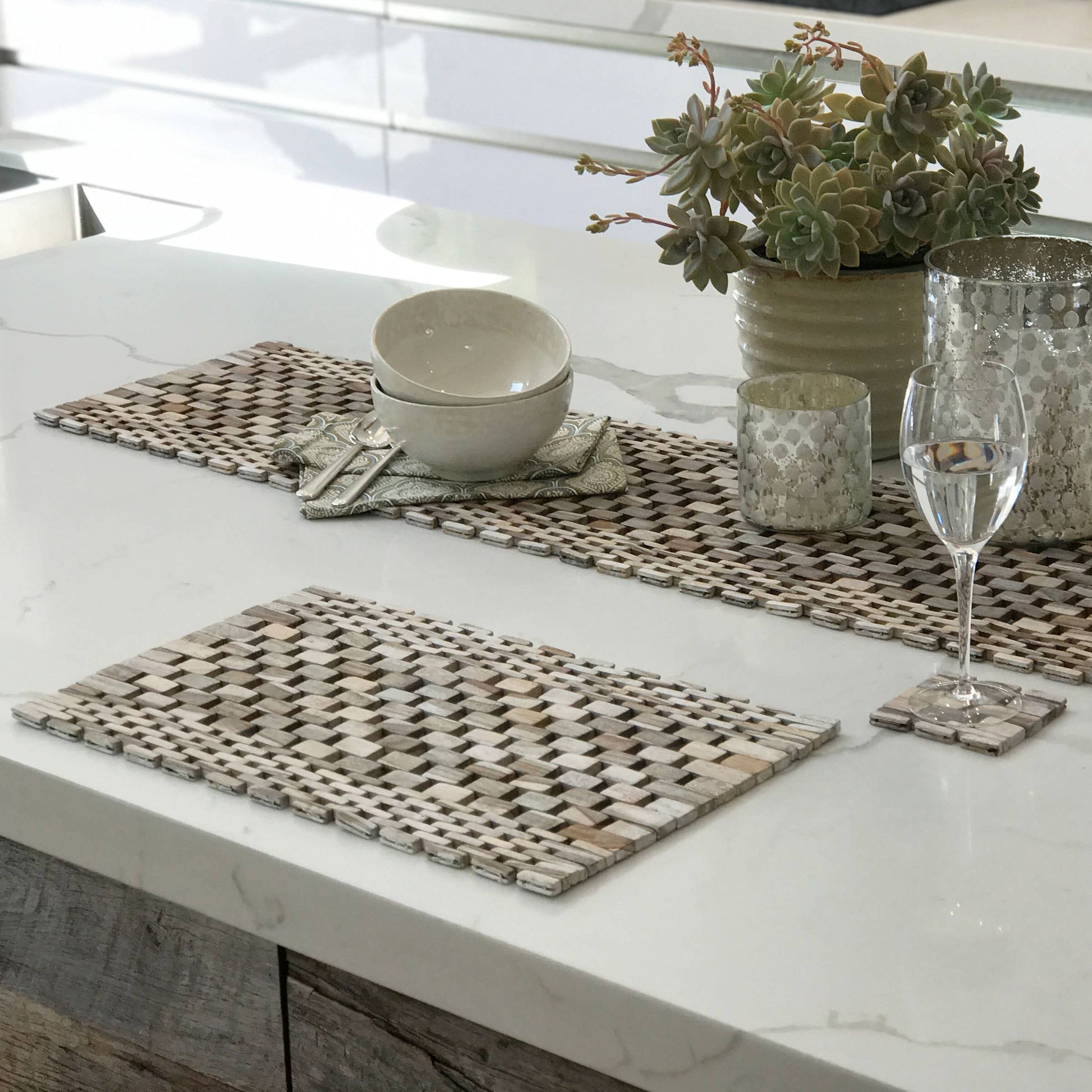 These beautiful placemats are hand-crafted out of small pieces of recycled teak and Rosewood that would otherwise be destroyed. Adding texture and depth to any indoor or outdoor table arrangement, the mats will protect your table and surfaces from heat and moisture. Matching coasters and Table runners are also available to spice up any table setting.